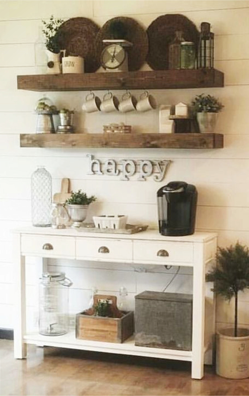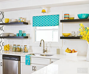 بدلاً من التخلص من الخزانات العلوية الخاصة بك، حاول تحديث ديكور حائط المطبخ الخاص بك عن طريق وضع رف أو رفين مفتوحين على الحائط المفتوح الجديد، الأرفف المفتوحة تأتي في العديد من الأنماط والأشكال كما أنها سهلة التركيب، حافظ على تنسيق الألوان في المطبخ من خلال العناصر التي يتم وضعها على هذا الرف.
